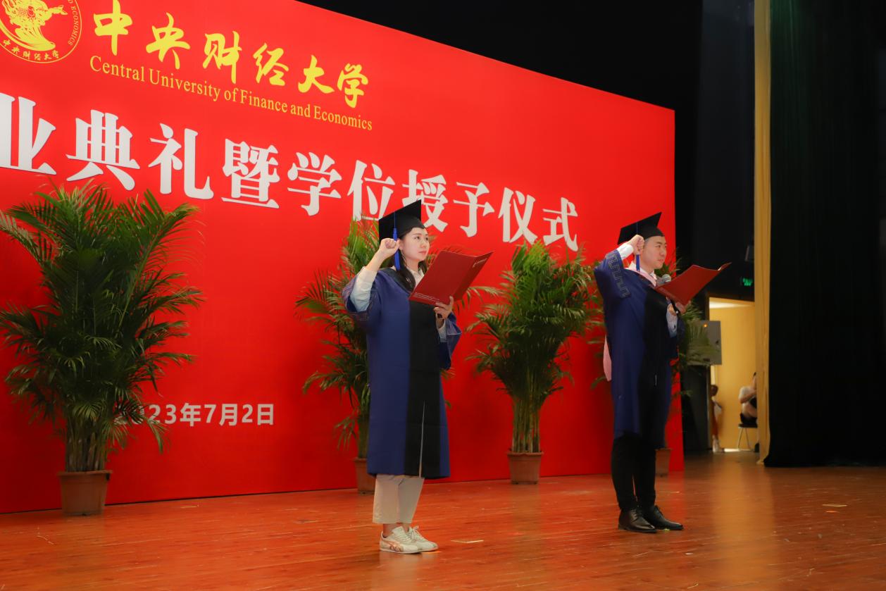 在2023届全日制MBA毕业生李霞和2023届非全日制MBA毕业生孟汉霄的领誓下,全体毕业生共同宣誓。在响亮而坚定的宣誓声中,毕业生们追忆过去,仰望未来,期待未来在人生的广阔舞台上砥砺奋进,努力做新时代伟大事业的坚定开拓者。