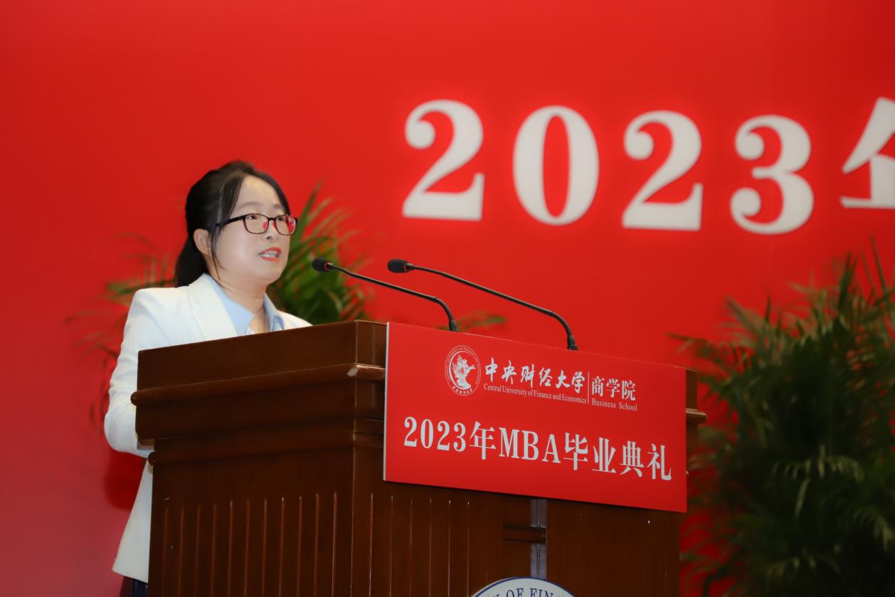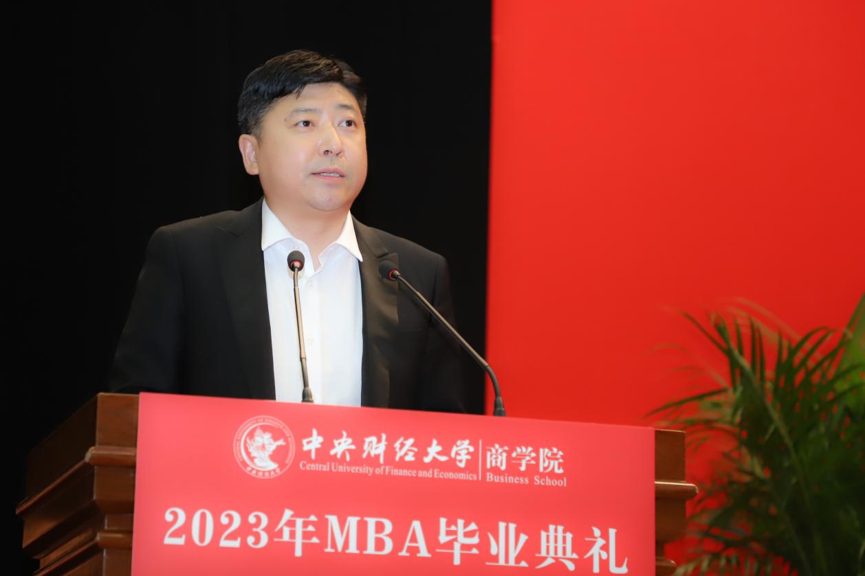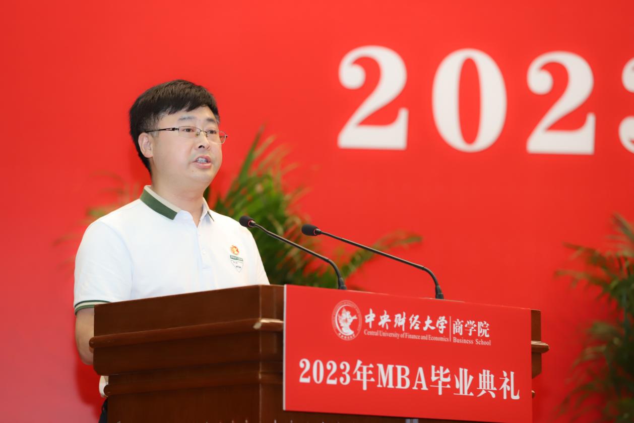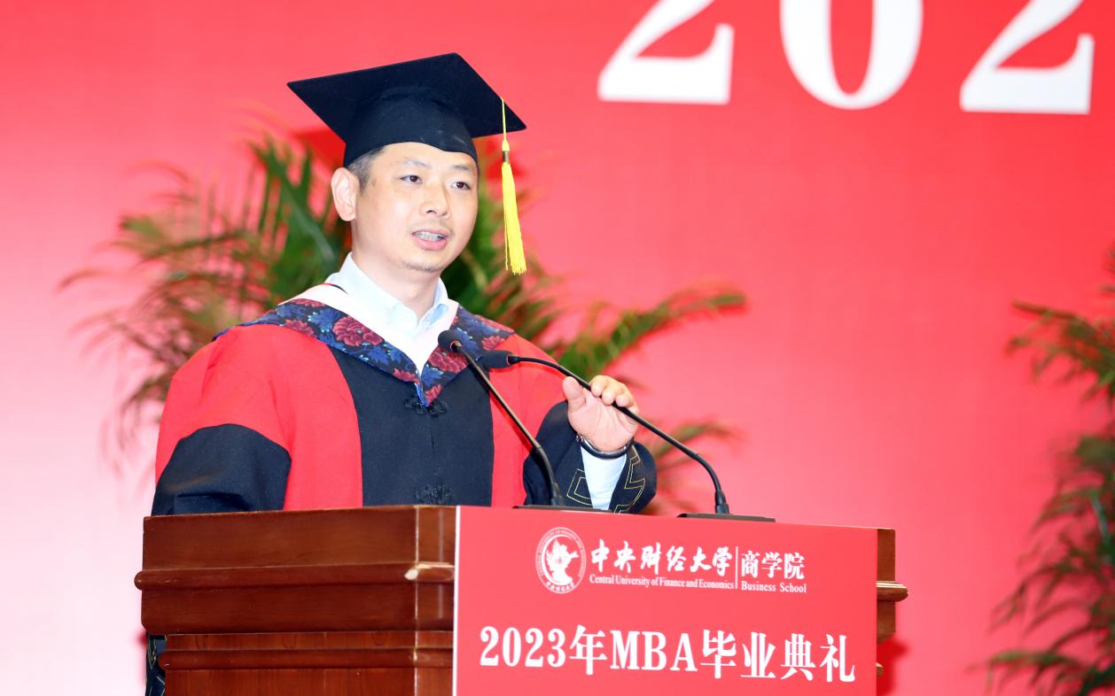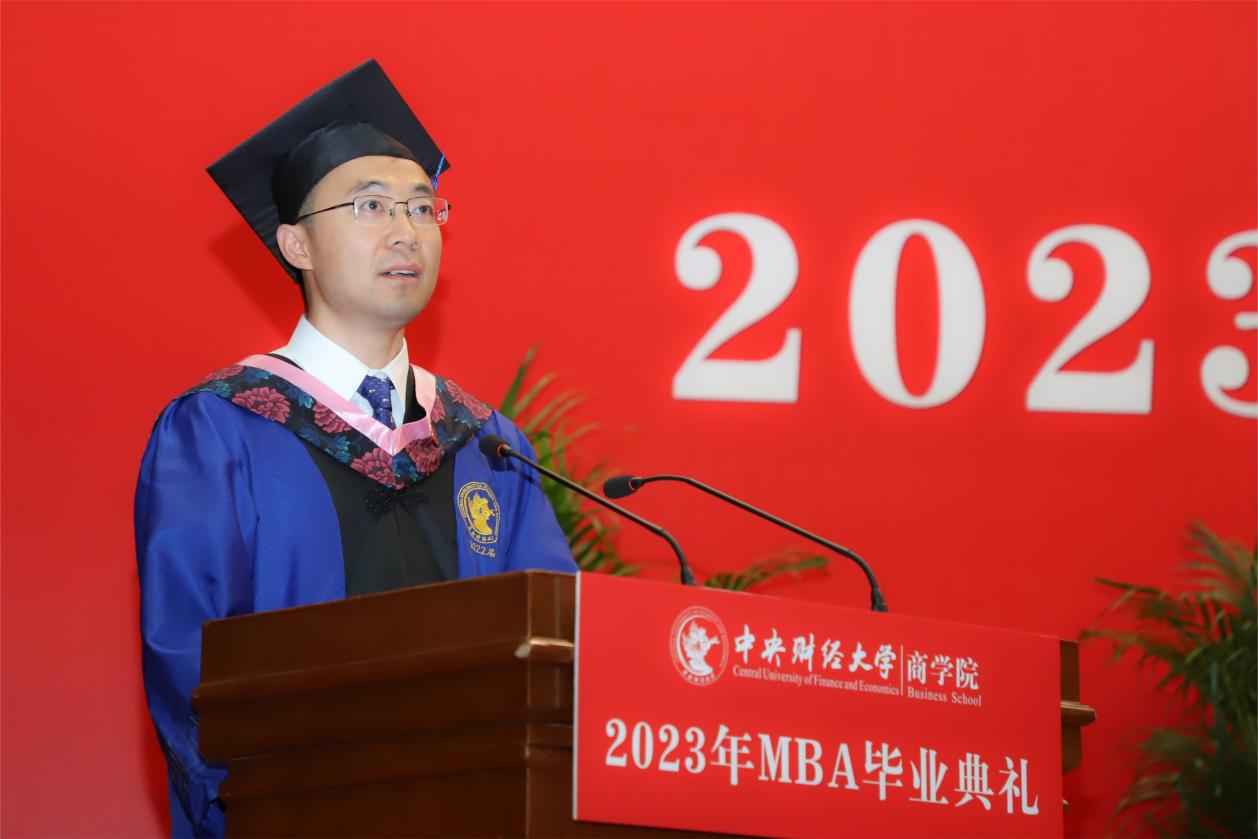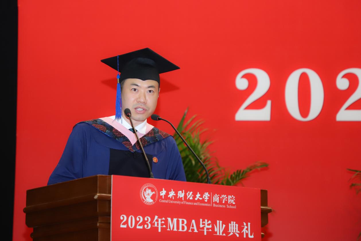 MBA任课教师于晓东作为教师代表发言,并向毕业生们献上真诚的祝福。他表示,非常高兴能代表学院全体MBA授课教师参加同学们的毕业典礼,见证大家毕业的喜悦,祝贺大家满满的收获,展望每个人美好的未来。他谈到,毕业为大家穿梭于工作岗位和学校课堂之间的辛劳和周折画上句号,也为大家开启了更高学位之下新阶段的开始和更高的目标与未来。于老师基于ylzzcom永利总站线路检测的“商”字 的架构,将对大家的期望与祝福也浓缩在一个“商”字中。“商”的上半部分的“立”,于老师引用《左传》里的“太上有立德,其次有立功,其次有立‘’,期望大家在今后的工作中和生活中,从立德到立功再到立言,都不能放松对自己的要求。“商”字的下半部分“冏”,于老师赋予了炯炯有神和代表光明的内涵,以此祝愿广大毕业生前景光明,祝愿我们的国家拥有光明的未来。